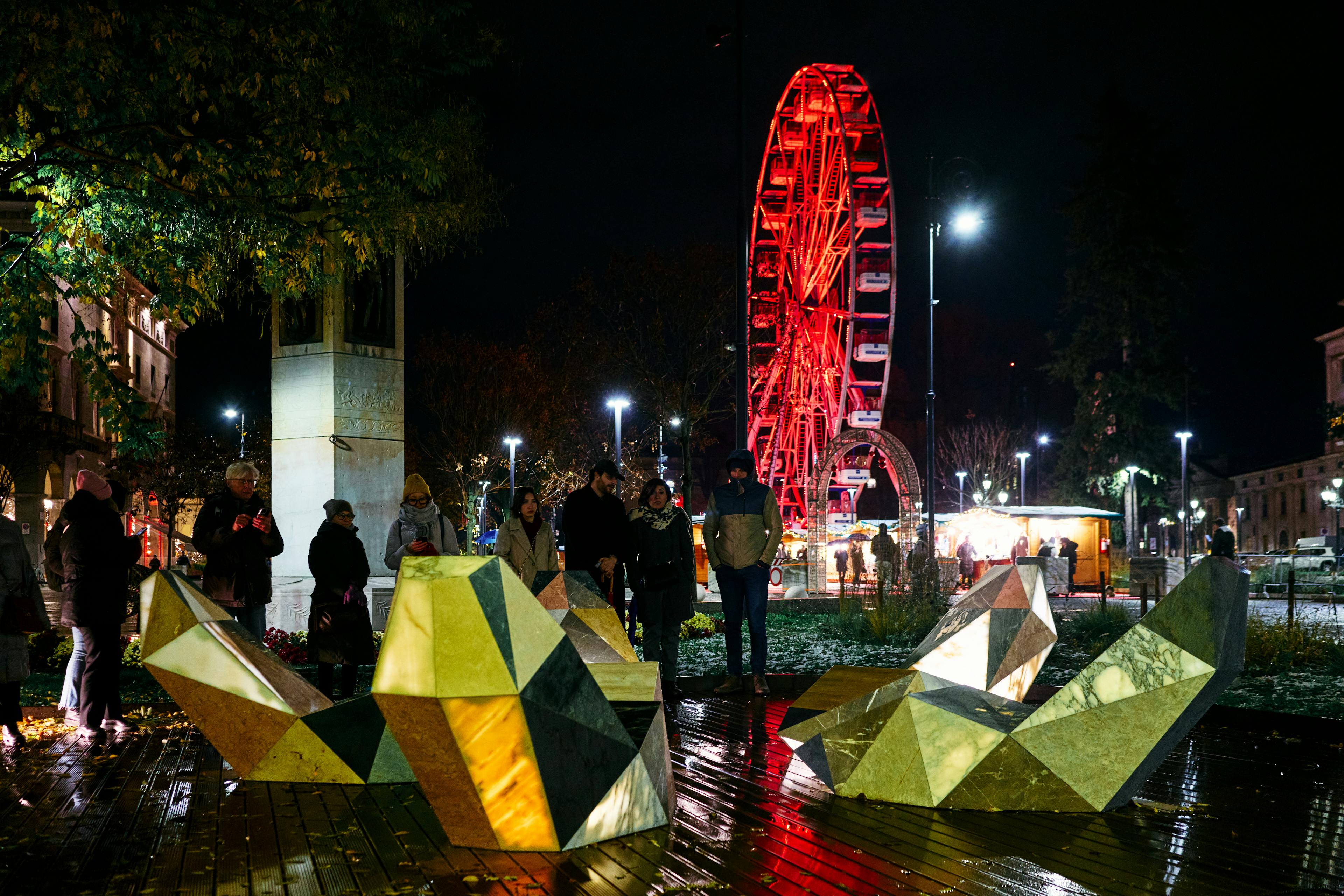 L’opera “E uscimmo a riveder le stelle” è stata commissionata e realizzata dall’azienda bergamasca Mutti Marmi, con il progetto del designer Luca Schieppati. La loro collaborazione nasce anni fa ed è basata su una mission comune di tradizione e innovazione, culto del materiale e sguardo costante al miglioramento continuo. Il titolo dell’installazione è tratto dall’ultimo verso dell’Inferno di Dante che racchiude un senso profondo di rinascita: dopo il buio e lo smarrimento si torna a respirare la luce e a contemplare le stelle. Nel contesto del Christmas Design 2025, dal tema “Palcoscenico dell’immaginazione”, l’opera vuole essere un invito a sollevare lo sguardo e a ritrovare nella contemplazione del cielo la possibilità di sognare di nuovo. L’installazione si compone di cinque chaise-longue di design in marmi policromi, disposte a raggiera in Piazza Matteotti a Bergamo, con l’ambizione di creare una sorta di cerchio rituale, uno spazio di sosta e condivisione. La scelta del numero ci......