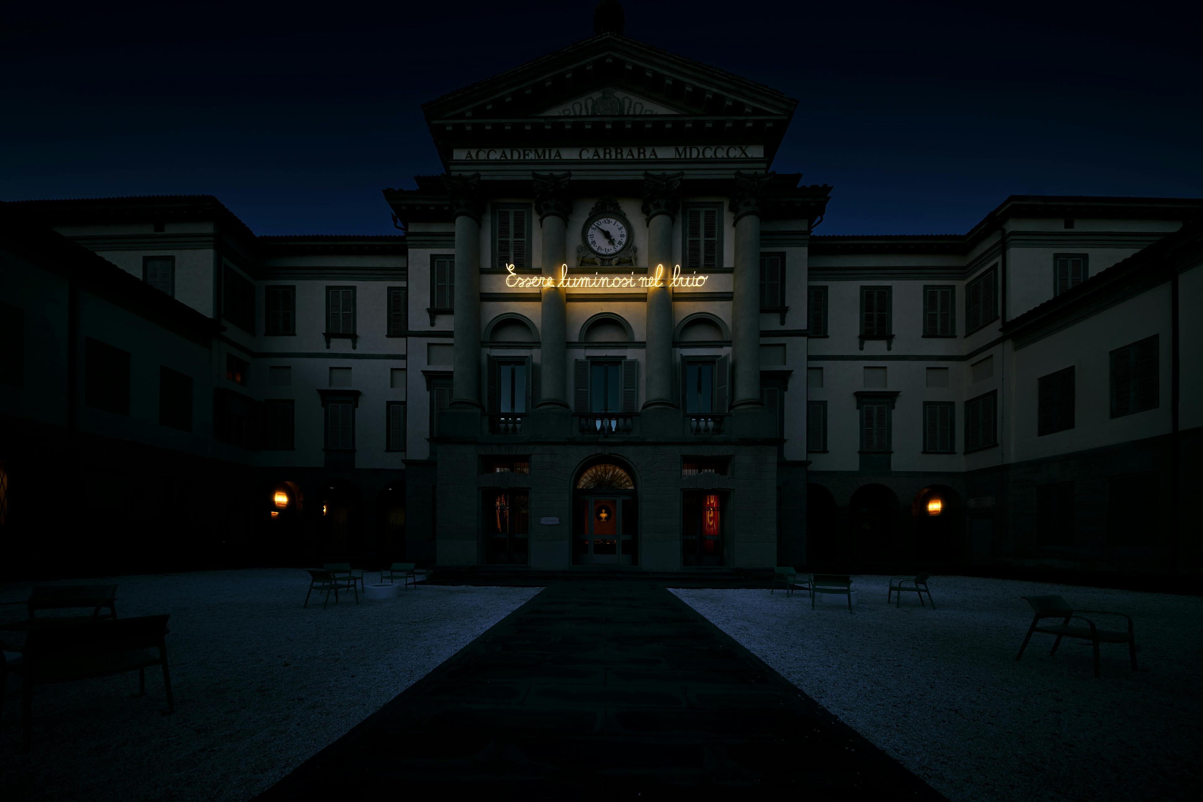 L'installazione Essere luminosi nel buio è una scritta di neon bianco che si relaziona temporaneamente con la facciata dell'Accademia Carrara di Bergamo, appoggiandosi alle linee orizzontali della sua architettura neoclassica. Essere luminosi nel buio è al tempo stesso una dedica ad Etty Hillesum ed è una libera interpretazione del suo pensiero (preciso e profondo) dentro l’orrore e l’angoscia della storia che attraversa. La frase è scritta a mano da Matteo, un bambino - il figlio dell’artista Emma Ciceri - che da poco pratica la scrittura in corsivo. Così, le parole e il senso di cui queste sono portatrici arrivano al mondo adulto dalle mani di un bimbo. Il pensiero profondo di Etty Hillesum ha la capacità di saper accogliere e contenere i movimenti esistenziali e universali accompagnandoli in una coralità umana. Cosa è indispensabile immaginare oggi? Interrogandosi sul piano esistenziale, Emma Ciceri ha ipotizzato una risposta intima e rivoluzionaria al tempo stesso: rendere la propr......