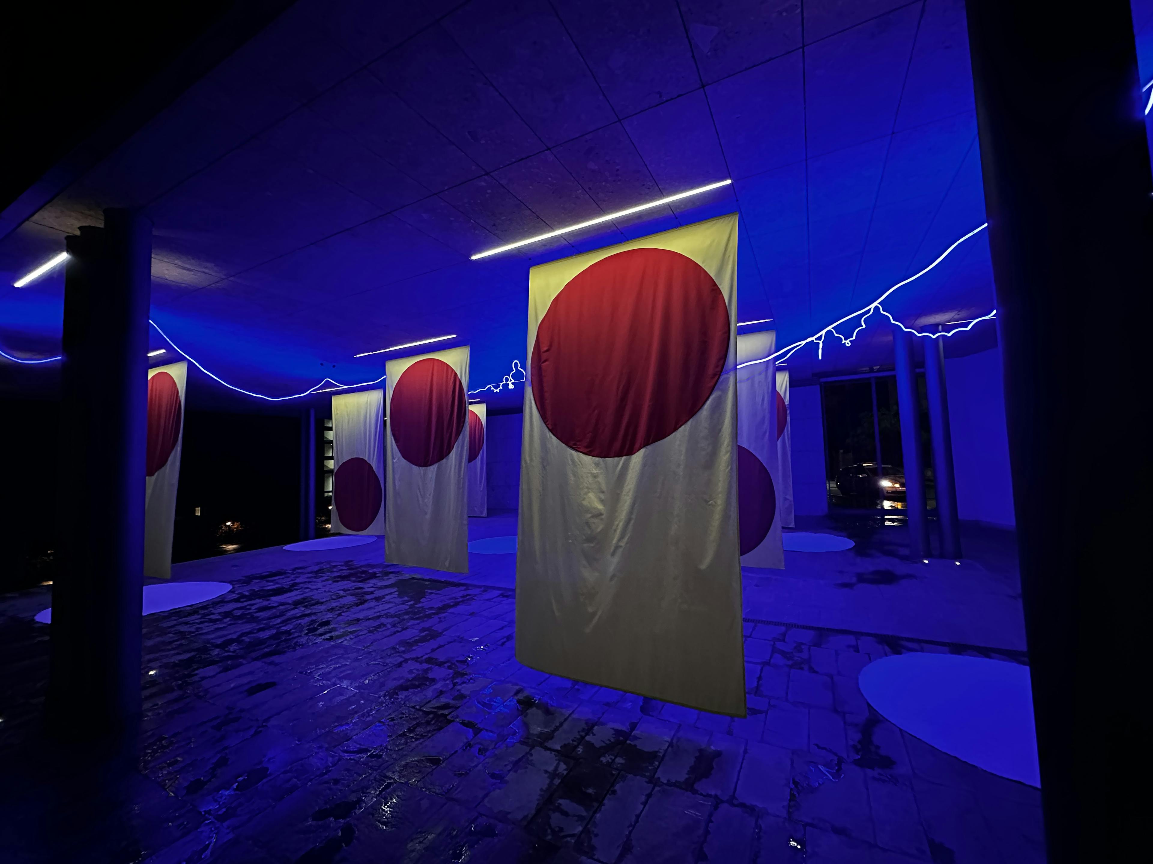 Un tripudio di quinte scenografiche che cadono a piombo dal soffitto nel cortile coperto del passaggio pedonale di via Mazzini, 4 invita a superare il cancello e a liberare la fantasia. L'installazione immersiva Play, sposa appieno il tema "Il Palcoscenico dell'immaginazione" architettando un universo parallelo fatto di colore e di luce. Le bandiere sono un richiamo ai tendaggi del teatro: l’elemento che solitamente divide il palcoscenico dagli spettatori. In Play, tuttavia, viene scomposta tale disposizione canonica. Abbattendo questo confine, l’opera diventa una scenografia dove attori e spettatori sono la stessa cosa, impersonano lo stesso ruolo. lI titolo stesso Play ha una doppia accezione. Play è un riferimento al teatro - perché play in inglese è l'opera teatrale - ma anche un invito al gioco; il verbo to play si traduce in giocare. L'aspetto ludico è rappresentato tramite l’uso di forme semplici ed evocative e segni forti come il cerchio e il rettangolo, colori accesi e una di......